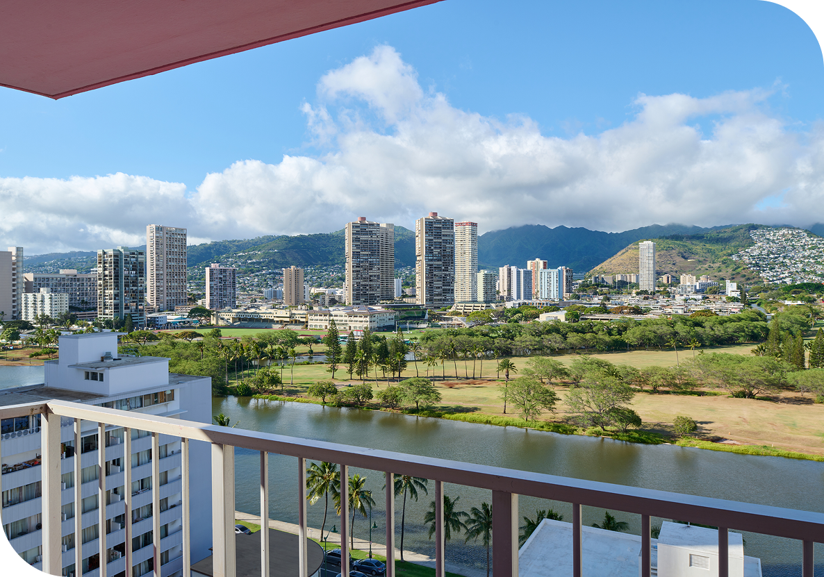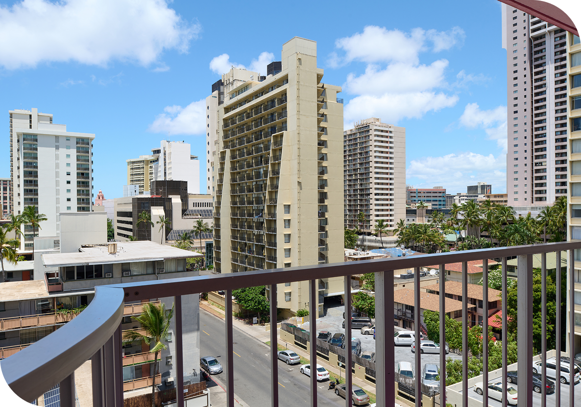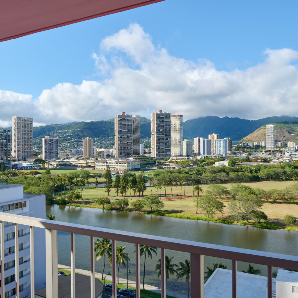 Studio views vary and may include city views or mountain views overlooking the Ala Wai Canal. While studios don’t have ocean views, the higher floors tend to offer the best outlooks.